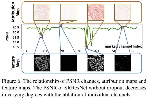 上图给出了PSNR与显著性图之间的相关性。当我们对某些特征进行mask后,我们可以得到不同的PSNR值,低PSNR对应了更亮的显著性图,更亮的只意味着对超分结果的更大影响。很明显:不同特征对于最终的结果影响程度是不一样的。