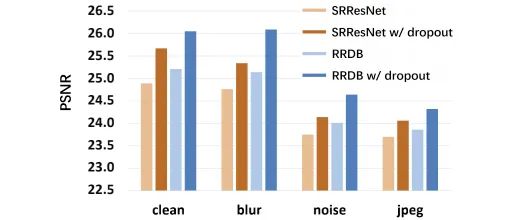 然而,本文研究表明:合理的使用dropout有益于SR模型,提升其泛化性能。具体来说,dropout更适合于嵌入到网络的尾部,并对于多退化情形帮助极大。下图给出了不同配置下采用Dropout前后的性能对比,可以看到:引入dropout可以大幅提升模型的泛化性能,甚至可以将SRResNet的提升到优于RRDB的程度。重要的是,添加dropout仅需一行code。真可谓:One line of code is worth a ten-fold increase in the model parameters.