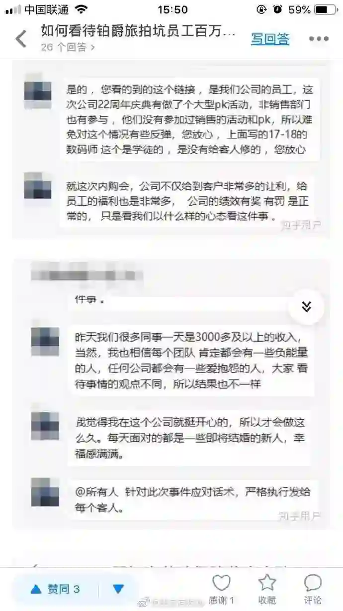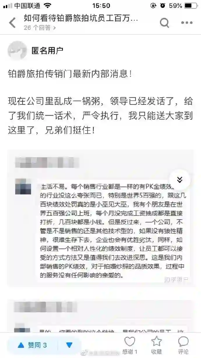 像这样被曝光涉嫌传销,结果再被锤出应对话术的公司,还真是少见的,到底是保密措施不到位还是内部员工“看不下去”爆料?有不少自称在铂爵旅拍工作过的网友在相关新闻下表示爆料的情况确实存在。
