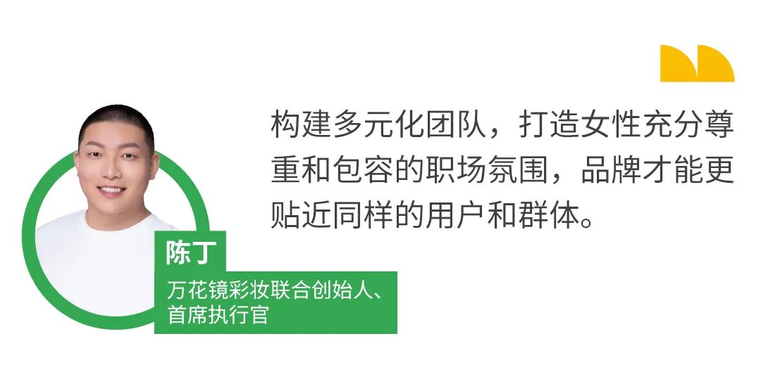 万花镜彩妆联合创始人、首席执行官陈丁立足于女性消费者的行业,他从团队内部举行的公开的性别讨论中感觉受益匪浅,令他意识到倾听女性以及多元群体真实想法的重要性。于是他着手实施了一系列措施鼓励更多优秀的、来自不同背景的员工加入他的创业品牌。