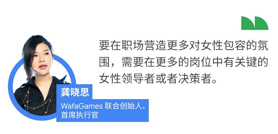 作为一名女性 CEO,WafaGames 联合创始人、首席执行官龚晓思在创业时遇到的思考之一就是:如何吸引更多女性玩家?——需要更多的女性内容创造者,以便创造出吸引女性的游戏内容。她的策略是从招聘广告开始实施,把女性视角放进招聘全流程,并在日常工作环境中注重营造友好的氛围,全方位向 “她” 展示着最有诚意的一面。