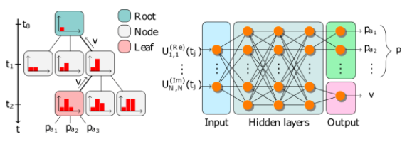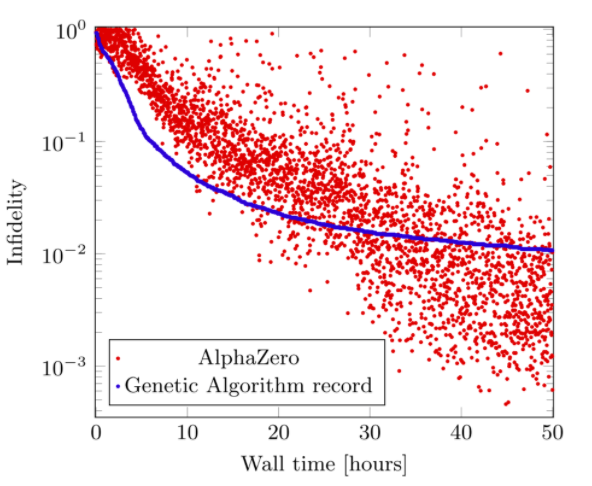 与普通计算机类似,量子计算机使用门操作(gate operations)来操纵其量子位。我们试图通过构建分段恒定的脉冲序列来实现特定的门操作,即AlphaZero必须为每个时间步长(time-step)选择一个脉冲幅度。物理系统在每个时间步长tj上都由一个4x4复杂的矩阵U(tj)进行数学描述,我们将其折叠成一个长度为32的向量。这是神经网络的输入,如图1所示。脉冲序列完成后,就可以将复数矩阵U(T)映射为一个实数,称为仿真逼真度(fidelity)F,该实数的取值在0到1之间。从本质上讲,仿真逼真度是一种概率度量,其中1表示100%成功。图1.AlphaZero使用的MCTS(左)和深度神经网络(右)的图示左图和右图分别演示了 AlphaZero 的树搜索和神经网络。利用树搜索中统一的搜索结果作为神经网络的输入项。神经网络的上限输出接近给定输入状态的现行策略,即 p a ∼ a pa ∼ a。同时,下限输出提供了一个能够预估期望最终报酬的值函数,即 v (s t)∼(t) v (st)∼ f (t)。在我们的工作中,我们发现以一致的形式向 AlphaZero 提供物理系统的完整信息,有利于提升它的性能,尽管这种方式可能比较难以调整以适应具有较大希尔伯特空间的系统。神经网络输出一个值,该值是对最终仿真逼真度v≈F和一些移动概率p=(p1, p2, ...)的估计。两者都在蒙特卡洛树搜索中使用。树由节点(状态)和边(状态-动作对)组成。树搜索从根节点开始,并通过在每个步骤中选择动作来贯穿树。选择哪种行动,是通过比较每一个边缘的内在属性,以平衡勘探和开发的方式进行的。一旦探索到了边缘,其内在属性将根据搜索结果进行更新。树中的正向搜索将继续,直到遇到一个以前未访问过的节点,然后将该节点添加到树中,并使用p初始化其边缘。搜索中的所有访问过的边都将使用v在反向过程中更新。一旦执行了多次此类搜索,AlphaZero将确定一个操作并更新根节点,而丢弃树的其余部分。最后,基于树搜索产生的数据对神经网络进行更新,使得v接近保真度,并且移动概率增加了选择更有希望动作的机会。简言之:蒙特卡洛树搜索允许AlphaZero向前看几步,从而可以在解决方案空间中进行更全面的搜索。这使得AlphaZero在长期策略至关重要的复杂任务中比大多数其他强化学习方法更具优势。成功实现AlphaZero之后,我们使用相同的算法超参数将其用于三个不同的量子控制问题。对于每个问题,我们将AlphaZero与更常规的算法进行了比较。例如,在图2中,我们比较了AlphaZero和遗传算法在50小时运行期间创建二进制脉冲的任务。在y轴上,我们绘制infidelity 1-F,这实际上是错误率(即越低越好)。最初,AlphaZero在学习量子力学关联时表现不如遗传算法,但是这个学习阶段相当短。在30小时内,我们发现AlphaZero的性能比遗传算法提高了一个数量级,并且具有大量独特的高保真脉冲序列。图2.遗传算法和AlphaZero在50小时运行期间的比较。在y轴上绘制了infidelity (1-F),这实际上是一个错误率