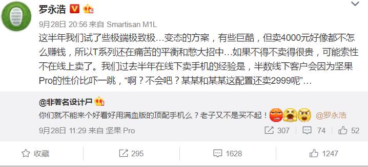 日前,罗永浩在微博上对新款T系列机型做了一些爆料,T3或要来了。网友@非著名设计尸在微博上吐槽并@罗永浩:你们就不能来个好看好用满血版的顶配手机么?老子又不是买不起!对此,罗永浩也做出了回应:这半年我们试了些极端极致甚至变态的方案,有些巨酷,但卖4000元也不怎么赚钱,所以T系列还在痛苦的平衡和憋大招中,如果不得不卖得很贵的话,可能就不会在线上卖了,将主攻线下。简单来说,锤子T3应该还研发路上,而且由于采用了极致的设计,最终价格会卖到4千元以上,甚至只在线下销售。
