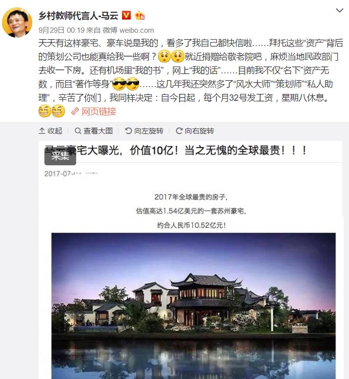马爸爸回应自家十亿豪宅:看的自己都快信了