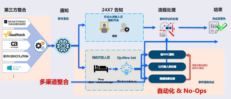 最新的版本OpsNow中,新增了AI功能AlertNow。OpsNow可整合多种第三方监控(包括AWS、Azure等),云环境产生故障或者报警时,系统会根据客户事先设定的规则对事件进行筛选和评估:无意义的事件或告警自动过滤;常规事件按照预定义脚本进行自动化处理;需要IT人员介入时,机器人会给相关人员发送通知。