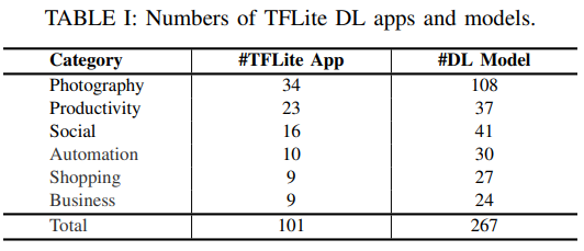下表 1 具体描述了当今流行的 App 中使用 DL 的具体情况。显而易见,包含 DL 模型的移动 App 已经覆盖了人们日常生活中涉及到的大多数应用分类 (