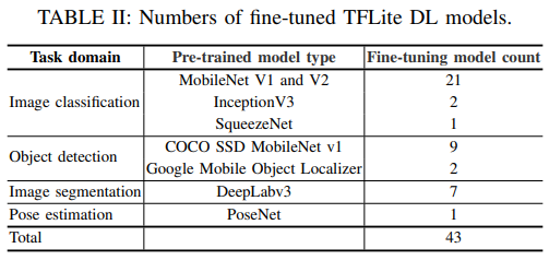 下表 2 具体描述了采用迁移学习的 DL 模型的数量和对应的预训练 DL 模型的类型,其中 MobileNet 是最为常用的预训练 DL 模型。