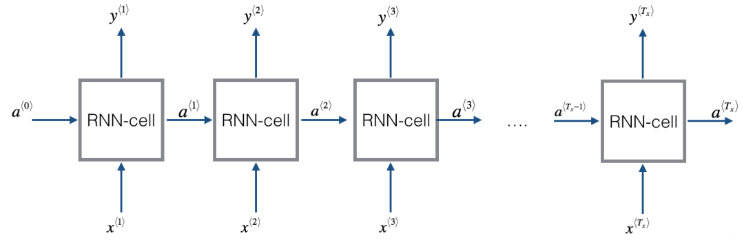 一个cell的前向传播完毕, 那么整个RNN的前向传播应该咋写呢?还是看图有了一个cell的计算, 整个RNN其实就是时间步的一个循环, 所以可以用一个时间步循环解决这个问题, 还是先分析一下, 接收的数据是a0和整个x, 这个x的维度就是(input_dim, m, timesteps), 而a0的维度就是(units, m), 而这里的输出有最后一步的a, 这个维度是(units, m, timesteps), y_pred, 维度是(n_y, m, timesteps)。 过程就是遍历每个时间步, 得到本时间步的输出y和下一步的输入a_next, 把这个加入到最后的y和a里面即可。