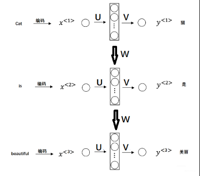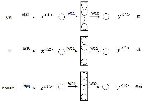 但是有些任务, 比如我们的输入是一个句子:Cat is beautiful! 让这个神经网络进行翻译, 我们一般要这么做, 首先,会把上面这3个单词转成向量的形式,要不然模型不认识, 可以通过one-hot或者embedding等, 然后我们喂入神经网络, 得到输出:应该是一个这样的过程, 上面这个图得好好理解一下, 这就是如果基于全连接网络的话会是这样的一个图, 这里之所以画成3步,就是为了后面更好的理解循环神经网络, 如果看过吴恩达老师的深度学习, 这里画的是这样的一个图: