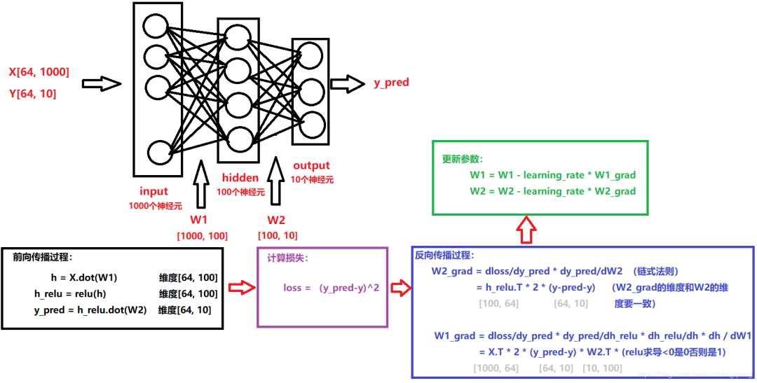 说到全连接神经网络, 我们应该是不陌生了, 并且也非常熟悉它的运算过程, 下面拿我之前画的一张图简单回顾一下神经网络:假设我有64个样本, 1000个特征,我们要做一个回归任务, 如果用普通的全连接的话, 会是下面的一个计算过程(这个相信大家都能看明白了):上面其实就是全连接网络的一个总体计算过程,左上就是一个全连接神经网络示意图, 一个全连接神经网络有一个输入层, 若干个隐藏层和一个输出层, 它的计算步骤包括前向传播, 计算损失, 反向传播, 更新参数,然后重复这个过程。具体细节就不再这里展开了, 这种网络功能也是非常强大, 由于激活函数的存在,也善于学习很复杂的非线性关系。