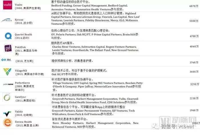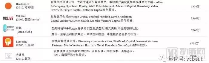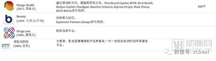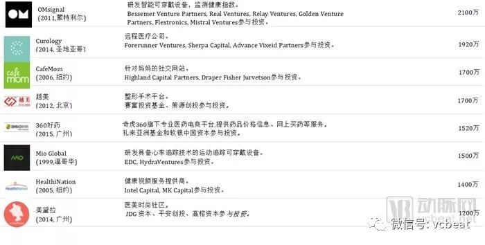 中后期“预备队”中,中国公司包括:春雨医生、美柚、健客、七乐康、咕咚、丁香园、趣医、新氧、大姨妈、医护网、华米、妈咪知道、名医主刀、越美、360好药、寻医问药网等。