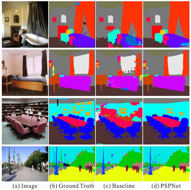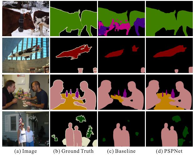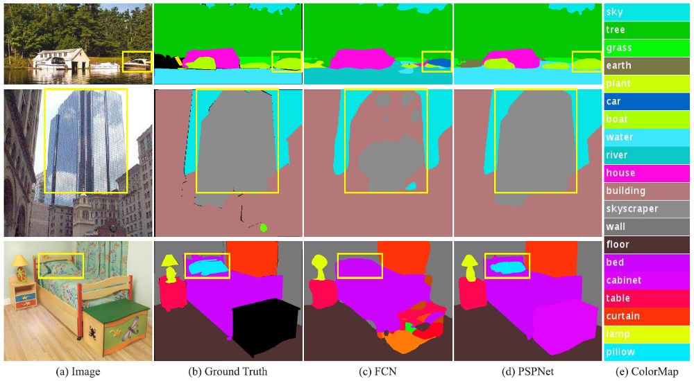 (c) 原有的未经上下文整合的FCN,(d) 经上下文整合的PSPNet