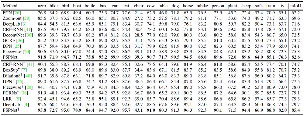 同样,PSPNet优于所有最先进的方法,如FCN、DeconvNet、DeepLab和Dilation8。