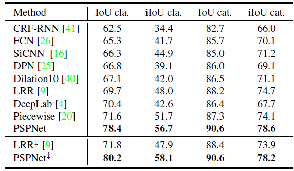 采用精细标注数据训练,或采用精细数据与粗略标注数据同时训练,PSPNet都取得了较好的效果。