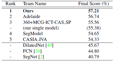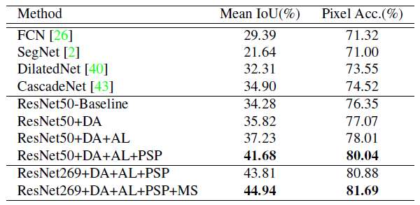 ResNet269+DA+AL+PSP: 对于单一尺度的测试,所有的技巧结合在一起的话,这种算法比最先进的方法有很大的优势。