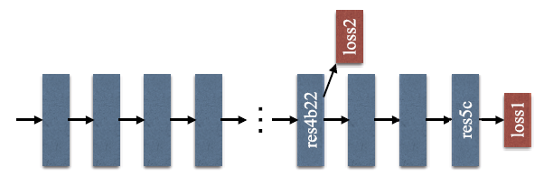 辅助损失项用于训练过程中。辅助损失项有0.4的权重,以用来平衡最终损失和辅助损失。在测试时,则会放弃辅助损失。这是一种针对深度网络训练的深度监督训练策略。这个想法类似于GoogLeNet / Inception-v1中的辅助分类器(https://medium.com/coinmonks/paper-review-of-googlenet-inception-v1-winner-of-ilsvlc-2014-image-classification-c2b3565a64e7)。