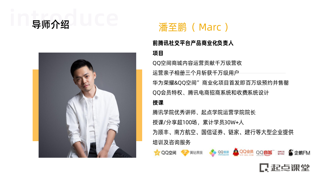 潘至鹏老师作为一个有着近15年运营实战经验导师,05年入职入职腾讯任职10年,快速从实习生晋升为高级运营经理,见证了多款亿万级用户产品成长的全过程,对于运营有着深厚独到的见解。