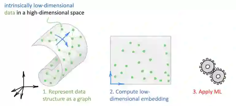 多种流形学习方法的蓝图:首先,将数据表示为图;其次,计算该图的低维嵌入;第三,将 ML 算法应用于这种低维表示。