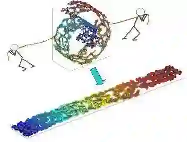 DGCNN 和 DGM 在概念上与流形学习或非线性降维算法相似,流形学习很早就已出现并流行,且目前仍用于数据可视化。流形学习方法的基本假设是数据具有内在的低维结构。虽然数据可以在数百甚至数千维的空间中表示,但它却只有几个自由度,示例如下: