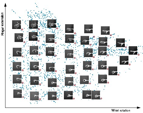 虽然这个数据集中的手部图像是高维的(64x64 像素构成 4096 个维度),但它们本质上是低维的,可以用两个自由度来解释:手腕旋转和手指伸展。流形学习算法能够捕捉数据集的这种内在低维结构,并将其在欧几里德空间中进行表示。(图源 [9])