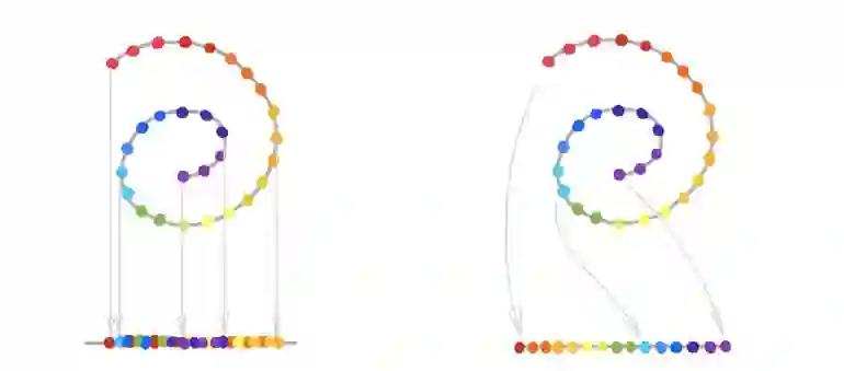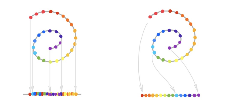 流形学习与 PCA 等线性降维方法的重要区别在于,由于数据的非欧几里德结构,我们可能无法通过线性投影恢复流形。如下图所示,线性降维(左)为线性降维,流形学习(右)为非线性降维。