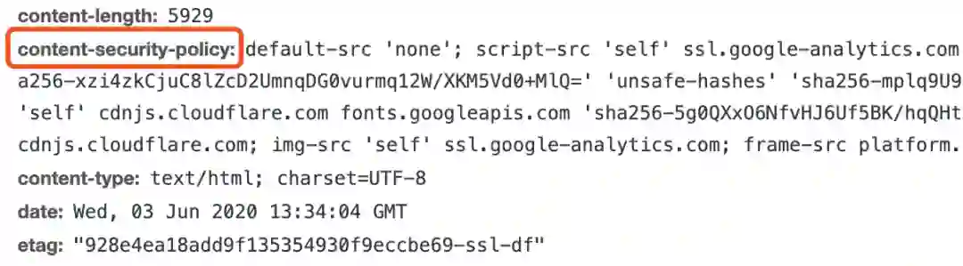 至于里面的内容,则是将所有可能出现外部资源加载的地方进行了指示,浏览器拿到它就能知道能去哪些地址加载对应的资源,如果资源所在的地址不在名单之内就拒绝加载: