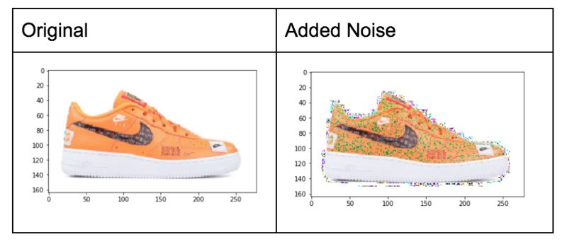 噪点是一种有趣的增强技术。 我已经看过很多关于对抗训练的有趣论文,你可以将一些噪点投入到图像中,因此模型无法正确分类。 但我仍然在寻找产生比下图更好的噪点的方法。 添加噪点可能有助于光照畸变并使模型更加鲁棒(编者就2:意思是这里让边缘光照发生失真,让尺度不变的情况下特征转变(SIFT),从而能增加鲁棒性(SURF),使得识别更加准确 ,不过,看这文章的水平应该是我多虑了)。