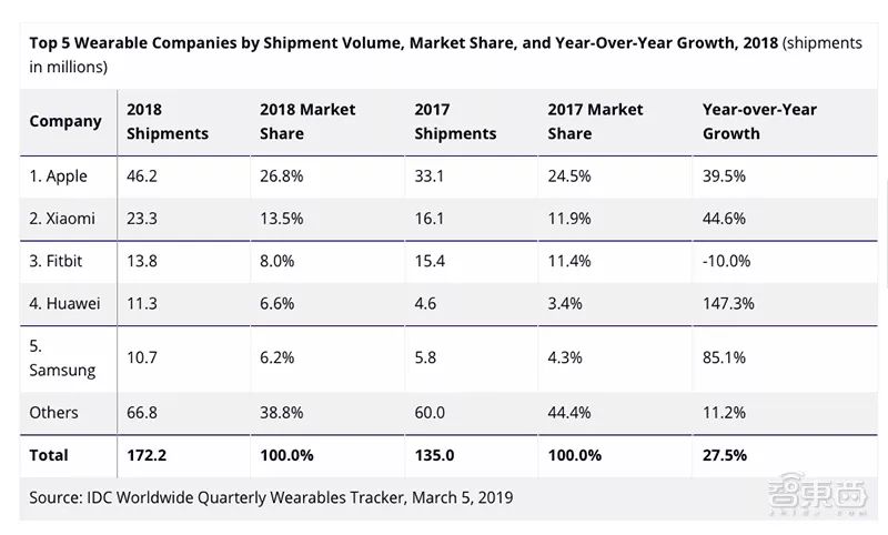 据IDC数据显示,2018年全球可穿戴市场实现了快速增长,出货量增长了27.5%,出货量达1.722亿件。其中市场份额位列前五的厂商中,除第三名Fitbit外,其余四家都是手机厂商。更可怕的是,只有Fitbit一家的出货量在减少,其余厂商都大幅度增长:39.5%、44.6%、147.3%、85.1%。
