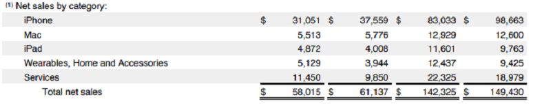 苹果一直以来的营收主力iPhone销量下滑,营收为310.51亿美元,同比下降17.3%。与此同时,苹果以Apple Watch为主的可穿戴设备业务营收大幅提升,可穿戴设备、家庭产品和配件产营收51.3亿美元,同比增加30%。