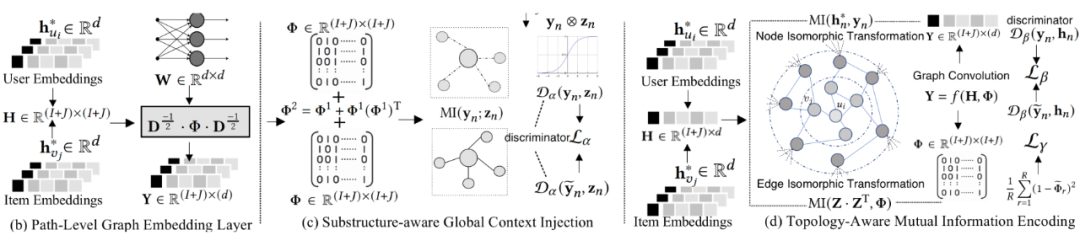 首先将跨元路径聚合后的用户结点特征和商品结点特征,作为用户-商品交互图的初始节点特征,先做一次基于图卷积的消息传递和聚合操作将交互模式注入到特征空间中,然后通过一阶邻接矩阵计算 k 阶邻接矩阵,进而得到以每个结点为中心的 k 阶子图全局特征,最后最大化中心结点特征和 k 阶子图全局特征的互信息。