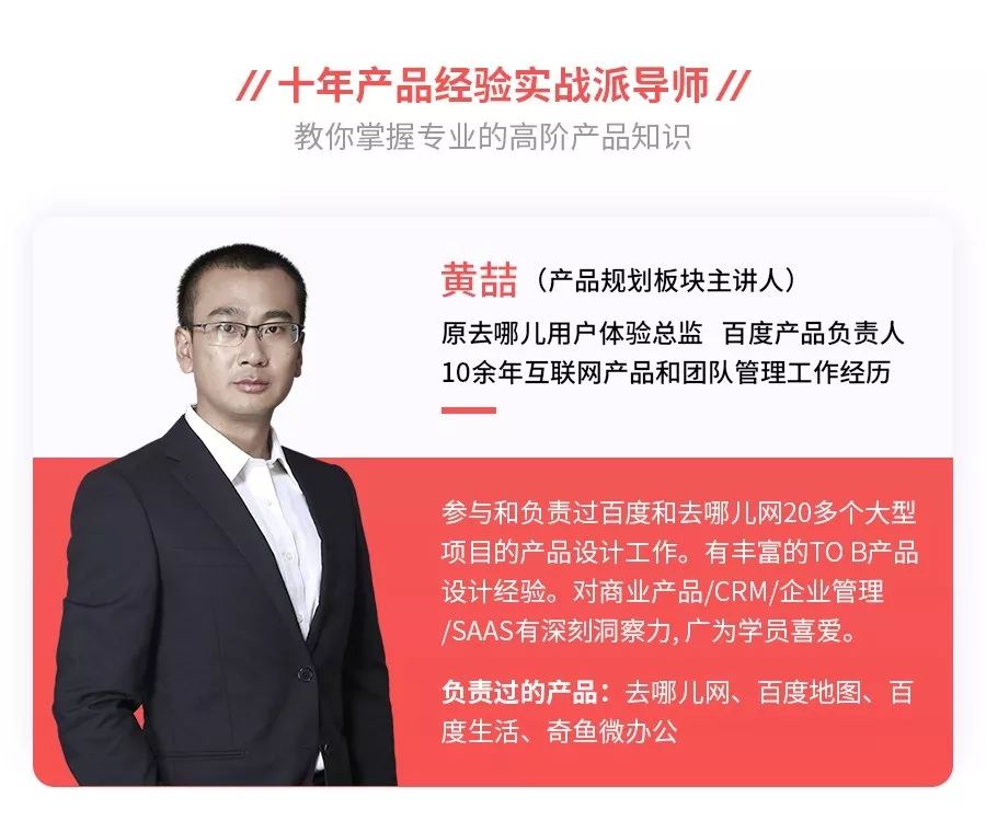 课程从“产品规划、产品运营、用户研究、数据分析”四大版块阐述了产品总监必备的核心能力体系,在详解了系统思维框架之外精讲多个行业产品跨界打法和落地实操技能。