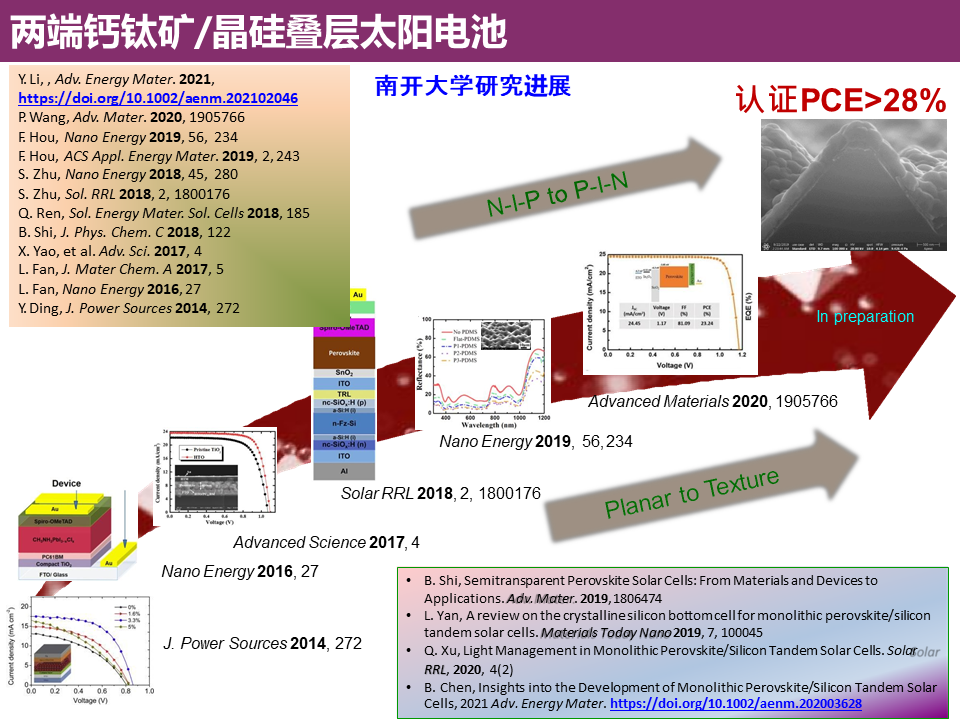 南开大学教授,光电子薄膜器件与技术研究所所长,教育部薄膜光电子技术工程中心主任,天津市光电子薄膜器件与技术重点实验室主任,中组部万人计划领军人才,科技部863计划项目首席专家,国家重点研发计划项目负责人。长期从事薄膜光电子材料和器件的研究,包括硅基薄膜、透明导电氧化物薄膜、钙钛矿薄膜和太阳电池等。在钙钛矿/晶硅叠层太阳电池、硅基薄膜叠层太阳电池和太阳电池绿色制氢等方面做出了贡献。主持国家973、863和国家重点研发计划项目(课题)等科技项目。以第一或通讯作者发表Energy Environmental Science和Advanced Materials等SCI一区论文近百篇;美国MRS等国际会议邀请报告10余次;主持太阳电池译著1部,参编著作1部;第一发明人获授权发明专利20余项。