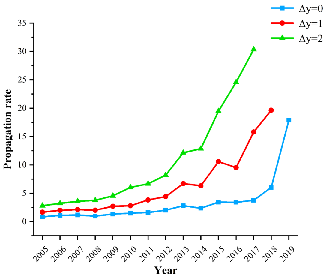 我们对 2005 年到 2019 年每年由 CCF corpus 中的文献提出的有效方法在数据集上的传播情况进行了分析。y 年提出的有效方法于 y 到 y+△y 时间区间内在数据集上的传播率计算公式如下: