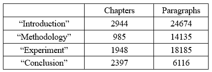 通常,一篇 AI 文献的正文包括引言、方法介绍、实验章节、结论四个部分。本文利用章节分类策略将 AI 文献的正文按上述四部分进行分类。
