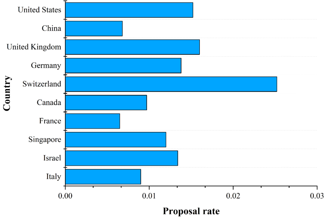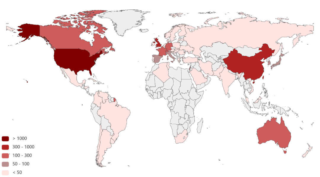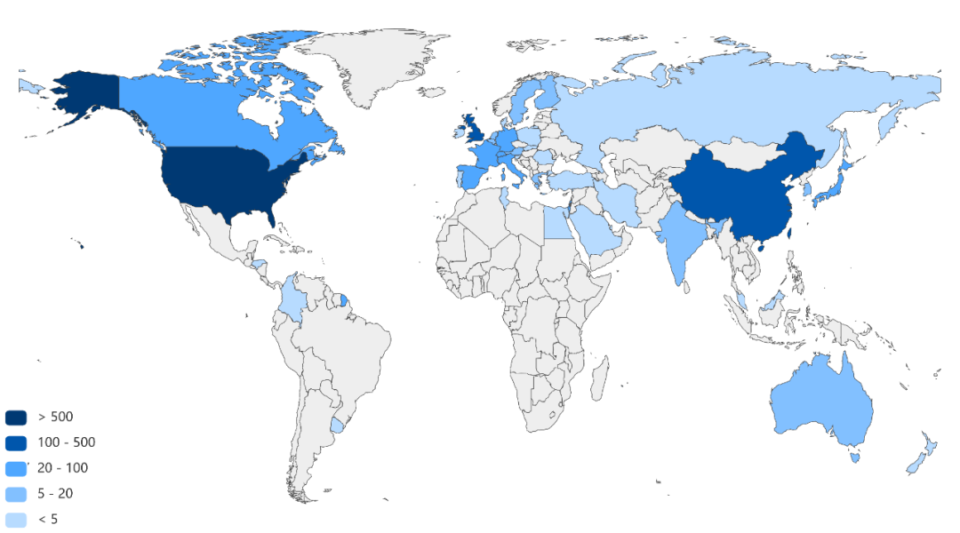 Figure 4:追溯到的由 CCF corpus 提出的有效方法在不同国家中的数量分布