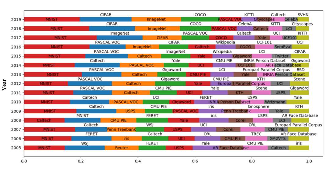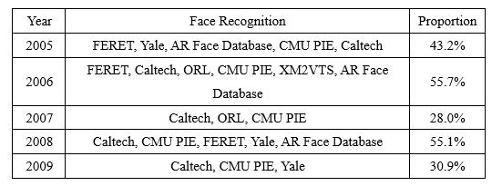 表 5 显示,2005-2019 年人脸识别的常用数据集有 Caltech、Yale、CMU PIE、CelebA。Caltech 在每年排名前十的有效数据集中均出现且占比都较高。Yale 出现的年份也很多,但是在 CelebA 数据集出现后,其地位就被 CelebA 替代。