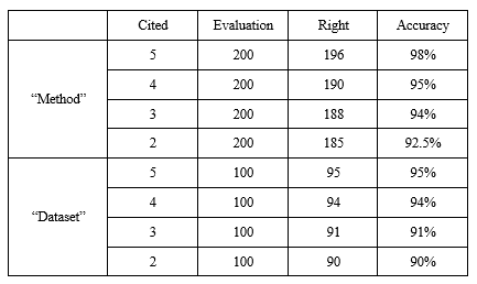 我们随机抽取得到的结果中被明确引用次数为 5、4、3、2 的方法各 200 个,被明确引用次数为 5、4、3、2 的数据集各 100 个。对这 800 个方法和 400 个数据集对应的原始文献结果进行人工评估,评估结果见表 4。结果准确率都超过了 90%。