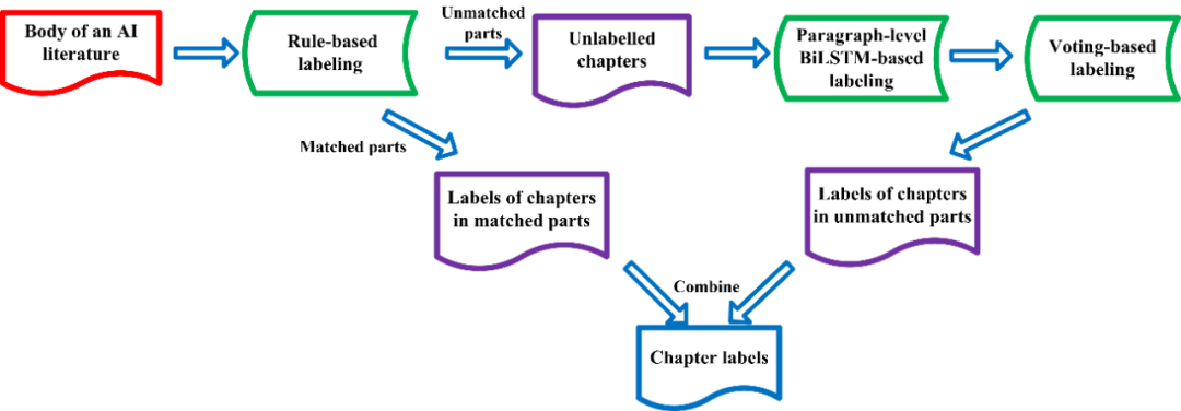 章节分类的整体流程如图 2 所示。对于一篇 AI 文献的正文内容,我们首先利用规则匹配(关键词和顺序)对正文章节进行标注。对于匹配到的章节,则输出章节标签。对于未匹配到的章节,则将章节下的段落输入到基于 TCCdata 训练的 paragraph-level BiLSTM 分类器进行预测。接下来对相同章节标题下的段落预测结果进行投票,将出现次数最多的标签作为该章节类别。最后,将基于规则匹配得到的章节标签与基于投票得到的章节标签结合,得到整个正文的章节标签。