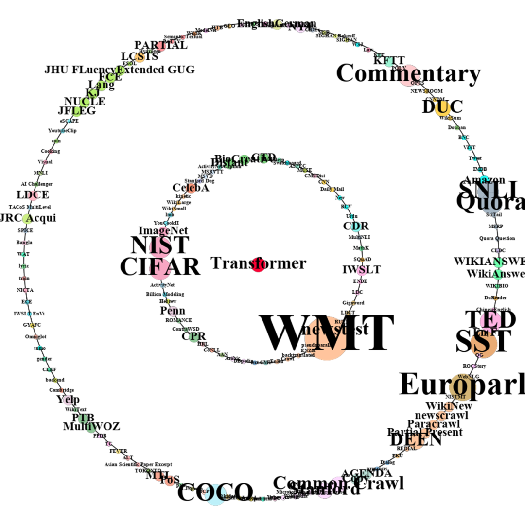 由图 11 可知,Transformer 在 2018 年被提出后,2018 年和 2019 年被应用在了很多不同数据集上。然而 2005 年被提出的 LMNN,在 2006 年才开始被其他文献引用,应用在不同的数据集上。并且,我们还可以明显看出,Transformer 从传播到其他文献开始,两年内在数据集上的应用数量和种类要远多于 LMNN。这也反映出随着时间的发展,方法在数据集上的传播速度越来越快。