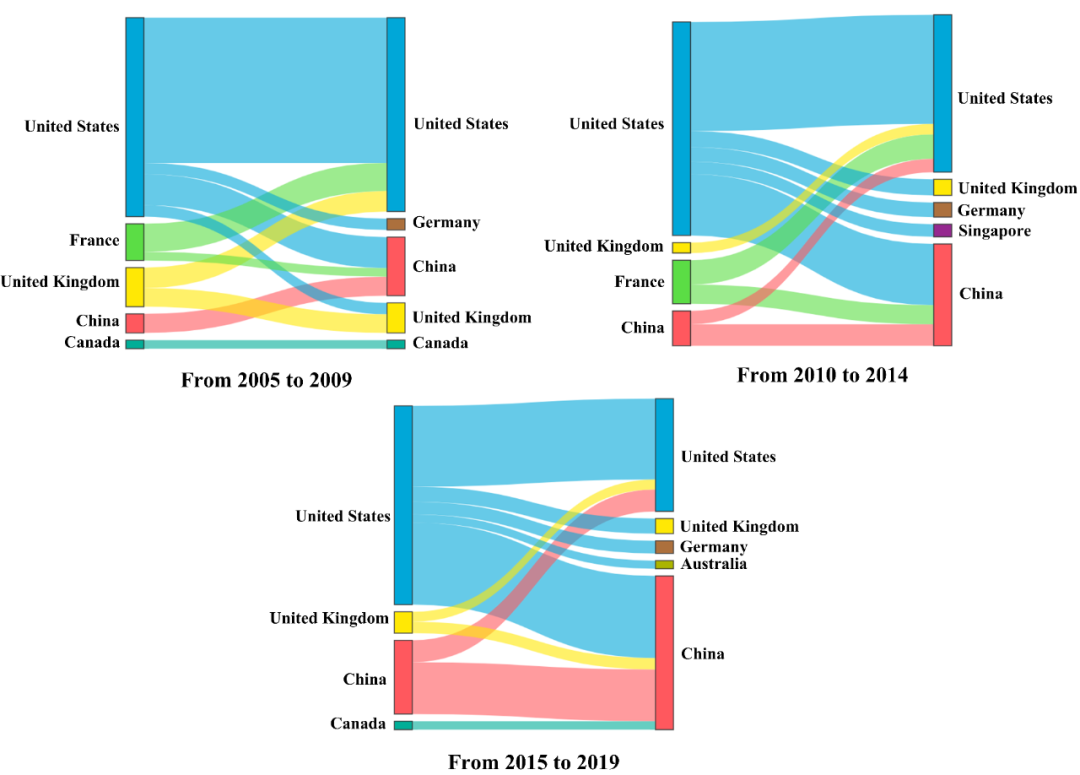 基于公式 9,我们以 5 年为一个阶段,对 2005-2009 年、2010-2014 年、2015-2019 年有效方法在国家之间的传播程度进行了计算。每个阶段排名前十的国家之间有效方法传播程度如图 12 所示。