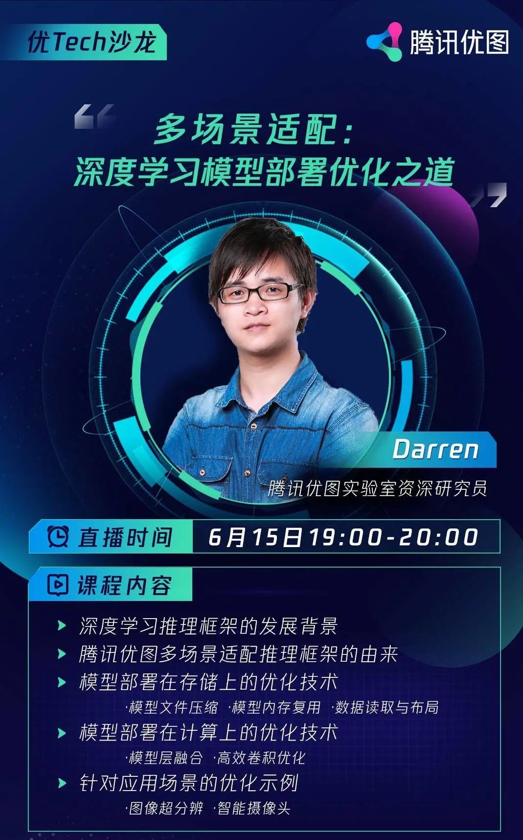 如果这款推理组件正好能解决你目前遇到的问题,或者你对它有着极大的兴趣,那么CVer 强烈推荐你参加此次由腾讯优图主办的6月15日的线上沙龙,届时腾讯优图实验室资深研究员Darren将为大家解读【多场景适配:深度学习模型部署优化之道】的主题分享。将帮助大家全面了解这个深度学习推断框架的前世今生,辅助大家快速上手在不同场景下的模型部署优化能力。