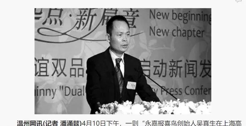 4月10日下午,一则“永嘉报喜鸟创始人吴真生在上海高速去机场的路上发生车祸,不幸遇难”的消息在朋友圈广泛传播,引发不少人的关注。