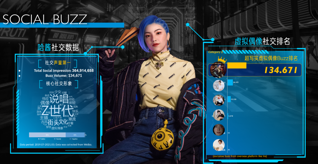 单眼皮、厚嘴唇、蓝色头的哈酱,定位是偶像化打造的嘻哈歌手。在人物小传中,她热爱国潮穿搭,既熟悉流行音乐,又热衷于传统文化。