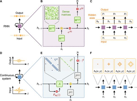 该研究证明波动方程在概念上等价于 RNN。这种概念上的联系为一类新的模拟硬件平台提供了思路,在这类平台中,演化时序在物理和数据集中都扮演着重要的角色。当我们专注于用标量波动方程描述的最普遍波动示例时,我们的结果可以很容易地扩展到其他类似于波的物理概念。这种利用物理执行计算的方法可能促进新型模拟机器学习设备新平台的研发,模拟设备有望比对应的数字设备更自然高效地执行计算。该方法的通用性进一步表明,许多物理系统可能是对动态信号(如光学、声学或地震学中的动态信号)执行类 RNN 计算的有力候选者。