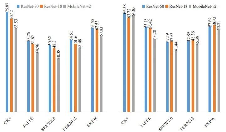 (2) 骨干网络选择不一致的影响: 当骨干选择不一致时,不同算法将无法公平的进行比较。为更好地理解这一点,我们在论文中分别以 ResNet-50,ResNet-18 和 MobileNet-v2 作为骨干网络进行实验分析。具体而言,我们分别统计了以 RAF 和 AFE 作为源域数据集时所有方法的平均测试结果:如图 5 所示,利用不同骨干网络进行特征提取会存在多达 12% 的性能差异,说明骨干网络选取不一致极大地阻碍了不同算法之间的公平对比。其中,图 5 所使用源域数据从左往右分别为 RAF 和 AFE。