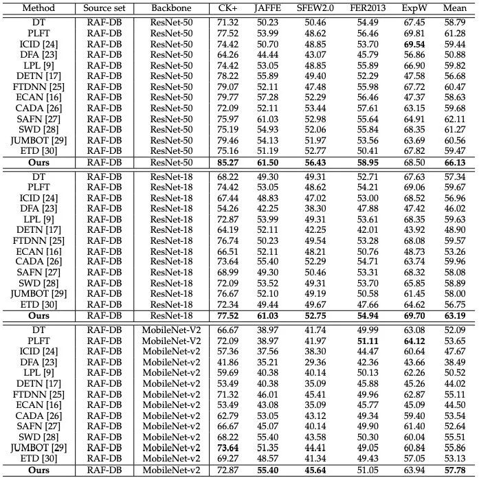 为了解决上述对比不公平的现状,我们构建了一个统一且公平的评测基准。该评测基准复现了多个效果较好的跨域人脸表情识别方法,以及数个最新发表的通用领域自适应算法,并使用统一的源/目标域以及骨干网络选择,以此进行公平的比较评测。与其他工作相比,该评测基准有多个优点:
