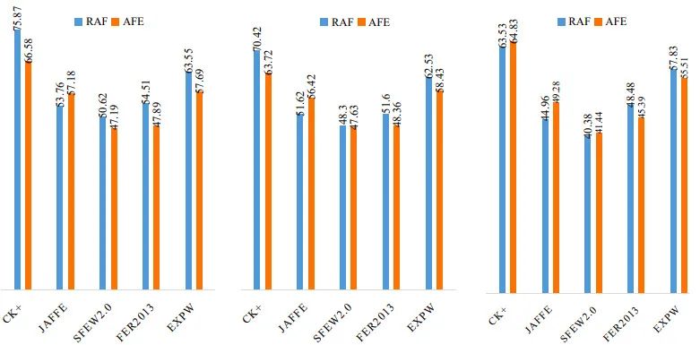 (1) 源/目标域数据集选择不一致的影响:当源/目标域数据集选择不一致时,不同算法将无法公平的进行比较。为更好地理解这一点,我们在论文中分别以 RAF 和 AFE 作为源域数据集进行实验分析,即我们统计了在使用不同骨干网络的情况下所有方法的评价测试结果:如图 4 所示,仅仅选取 RAF 和 AFE 进行源域对比实验就存在 9.29% 的性能差异,证明源/目标域数据选取不一致极大地阻碍了不同算法之间的公平对比。其中,图 4 中所使用骨干网络从左往右分别为 ResNet-50,ResNet-18 和 MobileNet-v2。