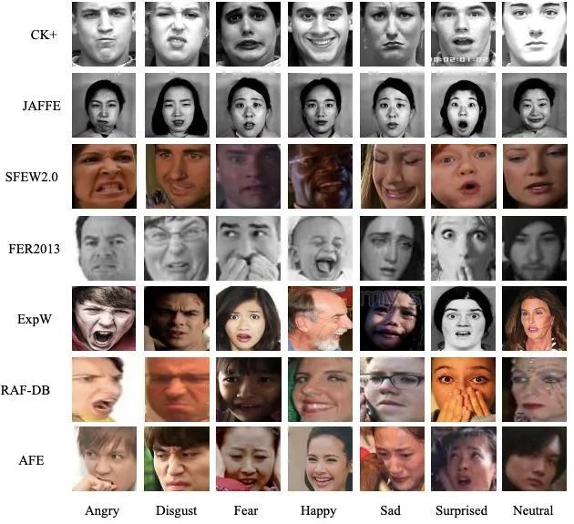 由于数据收集条件以及标注标准的不一致,各个人脸表情数据集之间存在较为明显的领域偏移,从而导致模型在跨域场景下的性能大幅下降。其中,数据收集条件不一致具体表现为收集环境不一致(实验室受控环境 vs 自然非受控环境)和目标人群不一致;标注标准不一致具体表现为不同数据集的标注人员对于表情的理解具有主观性,易受所处地区文化影响。如图 2 所示,我们可以直观地感受到不同人脸表情数据集之间所存在的明显差异。