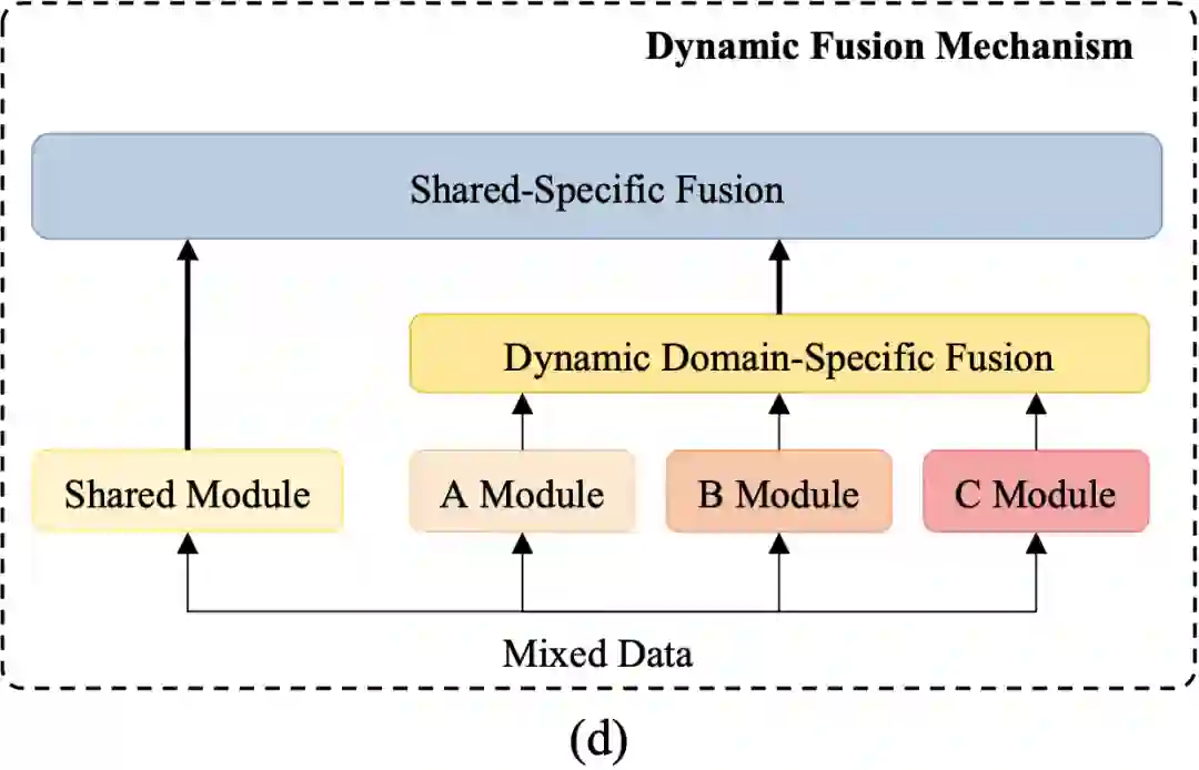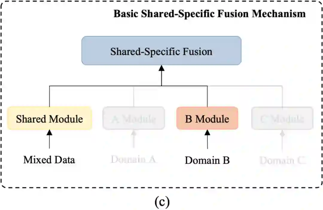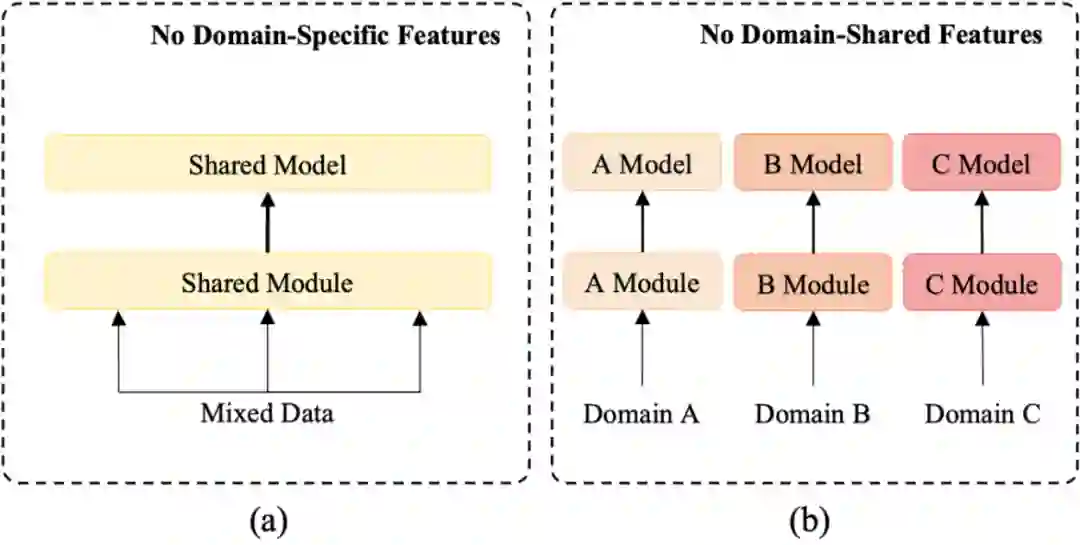 已有的工作可以分为两类:第一类是简单地结合多领域的数据集进行训练,这种方法能够隐含地提取共享的特征却很难有效捕捉领域特有的知识,如图 (a);第二类是在各个领域单独地训练模型,能够很好地捕捉领域特有的知识,却忽视了不同领域间共有的知识,如图 (b)。