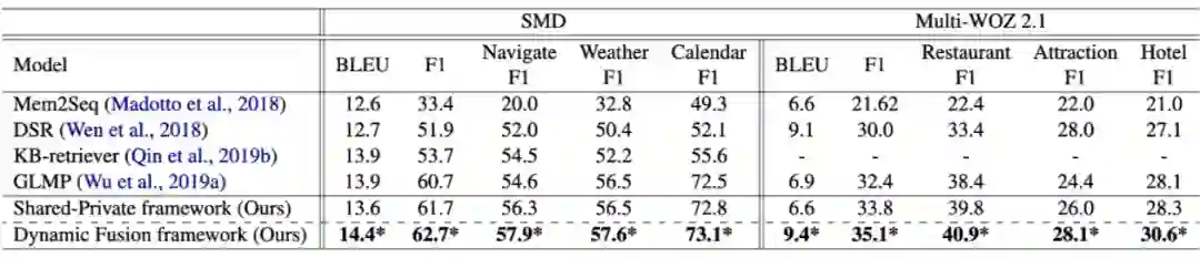 模型在公开数据集 SMD 和 Multi-WOZ 2.1 上进行了实验,获得 SOTA 效果。同时本文也是第一个在多领域端到端任务型对话系统中探索 shared-private 架构的工作。